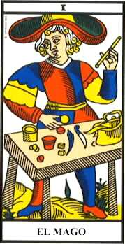 I — EL MAGO: Es la primera carta del Tarot; simboliza al Hombre Verdadero cuya misión es lograr la unión del espíritu y la materia. Con su mano izquierda sostiene una varita mágica que señala al cielo, y con la derecha una moneda de oro, símbolo de la tierra, en la que sus pies se encuentran bien plantados. En la inversión de los colores azul y rojo de sus ropas se señala el equilibrio de los opuestos; y este personaje emprende la obra alquímica trabajando con 3 principios y 4 elementos (simbolizados en las 3 patas y los 4 ángulos de la mesa) para lo que se mantiene permanentemente alerta. Para él siempre hoy es el primero y el último día de la creación, a la que se suma, cooperando con el Creador. El sentido más elevado de la carta lo determina su número, que indica el motor inmóvil, el Principio de todas las cosas; aunque su sombrero en forma de ocho apaisado es el signo del movimiento continuo. |