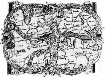 Siglos más tarde hallamos a Plinio el Viejo, que escribió una "Historia Natural", un estudio de los seres de la naturaleza (incluidos los fabulosos) en sus tres reinos, animal, vegetal y mineral; y también a su casi contemporáneo Josefo, que nos legó una "Historia Antigua" de los judíos; y a Plutarco, con "Isis y Osiris", o "Vida de los doce Césares". Más cercano a nosotros se encuentra Alfonso X el Sabio, autor, entre otras cosas, de una inacabada Historia de España y de una más extensa Historia General, que en realidad, y tomando como fuente de consultas a la Biblia y todas las crónicas antiguas que pudo reunir, resume la Historia Sagrada del género humano desde sus comienzos hasta el siglo XIII, época en que reinó. Por todo lo expuesto puede decirse que cualquier intento por reconstruir el pasado histórico, que se emprenda en la actualidad, debe pasar necesariamente por un conocimiento de la doctrina tradicional de los ciclos, que incluye también una comprensión de los símbolos y de los mitos que invariablemente se han ido repitiendo por doquier. ![]() En la figura anterior puede apreciarse el mapa del mundo dividido en 4 partes emanadas de un centro virtual, perfectamente equiparable con las 4 grandes edades temporales y su división –válida para cualquier subciclo– proyectadas desde una quinta edad mítica. La existencia de este tiempo mítico y este espacio virtual, coexistiendo perennemente en sus orígenes, es lo que permite y justifica cualquier intento de establecer analogías entre lo que hoy llamamos Geografía e Historia, sin lo cual ellas carecerían de sentido. Para los antiguos esto era así; y respondiendo estas ciencias, de modo manifiesto, a sus concepciones de Tiempo y Espacio, cualquier otra ciencia moderna que buscase las relaciones entre estas dos coordenadas, debiera, en su derecho, prestar atención a esta interrelación y a esas concepciones, conocidas por todas las culturas desde siempre, y no considerar al Tiempo y al Espacio como asuntos diferentes. |