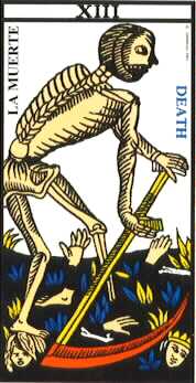 XIII — LA MUERTE: En esta carta, en la que predomina el color negro de la inmanifestación, se ve un esqueleto "vivo", que siega con una guadaña, cortando los miembros de los seres manifestados, dispersándolos. En el proceso iniciático es necesario experimentar en varios niveles la paradoja de vivir la muerte, muriendo a los aspectos inferiores y renaciendo "de arriba" a los estados superiores del ser. El adepto piensa constantemente en ella, tomando conciencia de lo ilusorio de esta vida transitoria, y sabiendo que en los misterios de la muerte están ocultos los de la inmortalidad. Ella es una aliada que nos enseña a meditar en lo metafísico y en lo trascendente; es regeneradora, y junto con la vida es nuestra verdadera iniciadora. La idea de la muerte está ligada a la de resurrección, pues siempre ocurre en un plano, terminando un ciclo y dando lugar a uno nuevo en otro nivel. |
