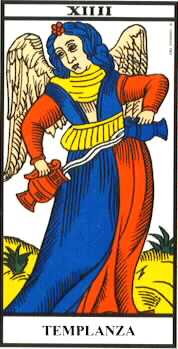 XIIII — LA TEMPLANZA: Es el símbolo de la resurrección y la nueva vida. Aquí vemos a una mujer alada, en actitud de vuelo, mezclando el contenido de dos vasijas, combinando las energías contrarias, a las que complementa, lo que también está simbolizado por los colores de sus vestidos. Se puede ver en ella a las Musas y a las Gracias que inspiran al artista, y en general al Arte como vehículo de conocimiento. Abre nuestra mente a nuevos aspectos del ser, cada vez más profundos y sutiles. Esta carta manifiesta las potencialidades ocultas que se van desplegando, y las facultades que se desarrollan y solidifican, así como las decisiones que se toman confiadamente y los estados de ánimo producto de la calma y la armonía. En el proceso alquímico representa los cuerpos luminosos y nobles que surgen a continuación de la muerte y la putrefacción de la materia vulgar. |