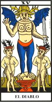 XV — EL DIABLO: Tenemos a veces una idea de este símbolo, condicionada por los prejuicios morales que nos hacen ver únicamente su aspecto invertido y maléfico. El diablo no es sólo el mal, sino que la tradición más bien lo ha relacionado con la estupidez y la ignorancia, así como con la mediocridad y la tibieza. Pero este símbolo ha adquirido para los iniciados una connotación más profunda, relacionada con la leyenda de Lucifer, el arcángel caído que lucha con Miguel, los que representan aspectos opuestos, complementarios y simultáneos del ser. Heredero del Baco romano y del Dionisio griego, el Baphometh de los Templarios y el amo de los brujos y brujas medioevales, o macho cabrío, es símbolo del vino y de la sangre y jefe de las entidades de la tierra o inframundo. Representa a la energía sexual y a la pasión o fuego interno que la transmuta de lo denso a lo sutil. |