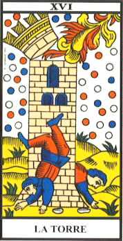 XVI - LA TORRE DE DESTRUCCION: Aquí vemos una torre construida con ladrillo (como la de Babel), cuya cabeza está siendo cortada por un rayo celeste. Es el símbolo de la destrucción de los esquemas viejos que propicia la construcción de otros nuevos. La ira divina que destruye la ilusión y la mentira para implantar la verdad. Dos personajes estrepitosamente caen a tierra, figurando a los falsos egos que van cayendo por su propio peso para dar lugar al verdadero Yo, oculto y esencial. El rayo representa la luz del espíritu; y las burbujas blancas, azules y rojas, los efluvios celestes que descienden a la tierra. Se la relaciona también con el betilo o piedra del rayo caída del cielo, con el martillo de Thor y con el rayo de Zeus; generalmente se la asimila a las energías marciales y a los dioses guerreros y su rigor. Invertida puede anunciar desgracias y cataclismos. |