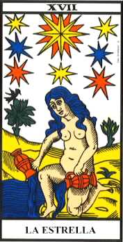 XVII — LA ESTRELLA: Carta de la naturaleza, lo es también de la belleza, la poesía y la naturalidad. Una mujer desnuda, que posa una rodilla en la tierra, derrama el contenido de dos vasijas rojas en un río (agua), a la vez que escucha el lenguaje sutil del pájaro (aire) y recibe los efluvios de las estrellas (fuego). Ella no lucha contra la naturaleza, sino que se armoniza e integra a ella en unidad, lo que le permite conocer sus leyes y experimentarlas, mostrándonos también el camino hacia lo sobrenatural. Se la relaciona con el color verde de la esperanza y la regeneración, y con la buena fortuna (buena estrella) que su actitud propicia. En su sentido invertido representa ese falso "naturismo" y "misticismo", tan en boga entre aquéllos que se suponen poseedores de una pretendida "bondad", en la que se esconde un prejuiciado moralismo propio de las sectas dogmáticas. |