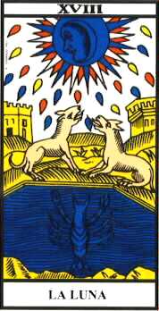 XVIII — LA LUNA: Símbolo de la noche, representa al principio femenino o matriz universal, esposa y madre dadora de formas, aunque a su vez es diosa de la imaginación, la fantasía y la ilusión. Su relación con los líquidos es evidente (la luna determina las mareas, la circulación de la sangre y la savia de las plantas, así como los ciclos femeninos), y esto la conecta con el mundo psíquico y los cambiantes estados del ánimo; como el agua, es una energía maleable que toma la forma de su recipiente. No tiene luz propia, sino que refleja como en un espejo los rayos solares. Se la ha relacionado con los viajes, en particular aquéllos que se realizan a través de las aguas y que simbolizan los más profundos viajes interiores. Y es la carta de la virginidad, o la vacuidad necesaria para que el espíritu fecunde. Invertida simboliza al sueño y al psiquismo desordenado. |